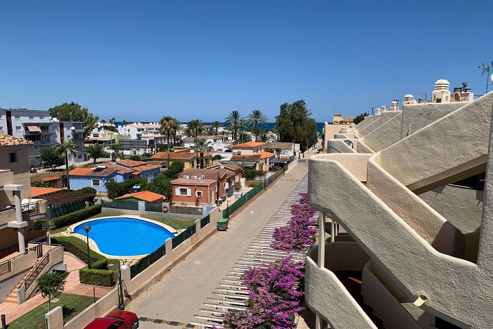 Das Atico befindet sich im 3. Stock - ohne Aufzug - mit Blick auf Meer und den Hausberg Montgo. Es gibt einen großen Balkon mit Grill zur Südseite und einer zusätzlichen gemeinschaftlichen Dachterrasse. Nur ca. 200 m zum Strand mit Restaurants und Cafés (Bona Platja) und 3 Km vom Stadtkern Denia entfernt. Bus, Einkaufsmöglichkeiten und Restaurants befinden sich in unmittelbarer Nähe. Es gibt einen großen Gemeinschaftspool und ausreichend, überdachte Stellplätze fürs Auto.