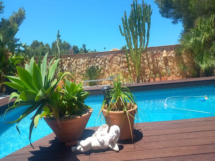 Das Haus ist ein freistehendes Haus in ruhiger Lage mit nicht einsehbarem Garten und Süßwasser-Pool (FKK möglich) am Fuße des Montgó. Ein gemütliches Balinesisches Bett im Garten lädt zum chillen und träumen ein. Es ist ein stil- und geschmackvolles Haus, mit Liebe eingerichtet und gepflegt, lichtdurchflutet und farbenfroh. Die Villa liegt in einer ruhigen Sackgasse mit Garagenplatz für das Auto.