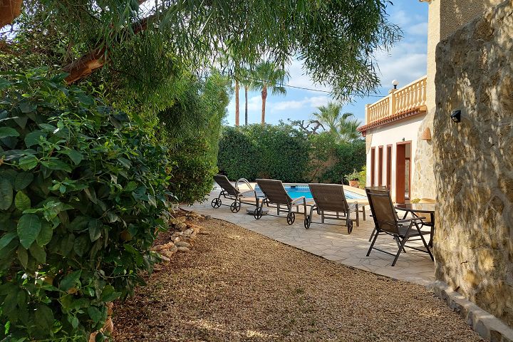 Diese traumhafte Ferienvilla liegt nur gut 2 km vom herrlichen Sandstrand in Javea entfernt in einem ruhigen Ferienhausgebiet. Das Haus betritt man über einen offenen Wintergarten, der zugleich als Essplatz dient. Von hier aus hat man einen wunderbaren Blick auf den 8x5 Meter großen Pool mit Außendusche und den mediterranen Garten. Eine überdachte Terrasse, Liegen und Sonnenschirm laden zum Entspannen ein.